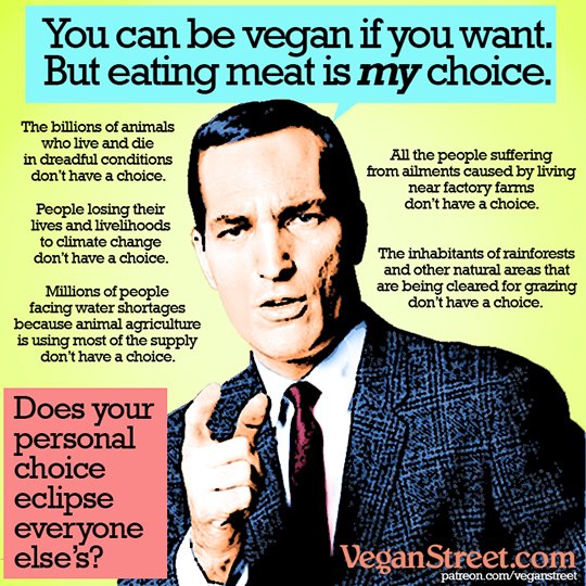 Eating meat is a personal choice just like being vegan is a personal choice, so everyone should just live and let live.